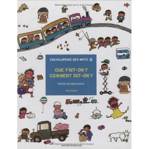 Que fait-on toute la journée ? on bâille, on court, on saute, on lit... mais encore ? Comment s'exprimer quand on veut refuser, saluer, dire merci, encourager... ? Avec esprit et humour, Taro Gomi met en scène les verbes et les expressions de la vie courante. Il invite les enfants à découvrir la richesse et la précision de la langue et, surtout, à s'amuser avec les mots !Album=77 pages. Tranche d'âges=3 - 5 années. Editeur =Bayard Jeunesse (27 avril 2007). Collection =Encyclopédie des mots. Langue =Français. ISBN-10=2747021955. ISBN-13=978-2747021951. Dimensions du produit=31 x 1,1 x 25 cm. Moyenne des commentaires client =5.0 étoiles sur 5 4 commentaires client. Classement des meilleures ventes d'AmazonEncyclopédiesAlbums=118.847 en Livres (Voir les 100 premiers en Livres) .zg_hrsr { margin: 0; padding: 0; list-style-type: none; } .zg_hrsr_item { margin: 0 0 0 10px; } .zg_hrsr_rank { display: inline-block; width: 80px; text-align: right; } n°189 dans Livres > Livres pour enfants > n°4481 dans Livres > Livres pour enfants >.Ouvrage que je recommande particulièrement. Surtout pour les parents qui ont des enfants en maternelle et en primaire. Il permet aux plus petits de commencer à déchiffrer des mots ou expressions, et pour les plus grands de développer leur vocabulaire. Un moment de plaisir à partager en famille.. Voilà un excellent moyen de faire découvrir les verbes à votre enfant.Les dessins sont simples et les situations rapidement comprises en plus d'être amusantes.Je l'utilise pour mes cours sur l'infinitif.Plusieurs domaines sont représentés : la maison, la rue, la fête foraine...Je le recommande vivement.. Il existe le même pour les adjectifs, à recommander vivement. Très richement illustré de scènes complexes, il est un support langagier particulièrement riche pour la maternelle jusqu'au moins CE1. On y trouve de nombreux verbes d'action, les formules de politesse, de salutations.... très beau, très joliment présenté et un riche vocabulaire. Je l'utilise pour mes classes de langue. C'est très bien. Pour les enfants ou pour les adultes..